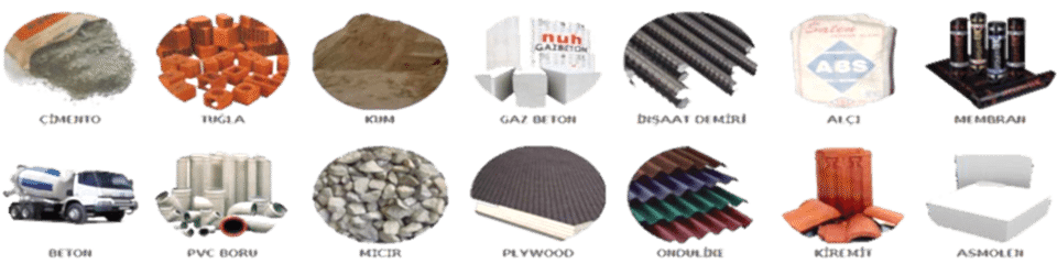Drenaj Levhası, Membran, Ytong, Multipor, İnşaat Demiri, Çelik Hasır, Beton, Kum ve Çakıl, Tuğla Çeşitleri, İzobims Tuğla, Nuh Gazbeton, Lento Ytong, Kiremit ve Çatı Sistemleri, Renkli Çatılar, Shingle Çatı Malzemeleri, OSB, Asmolen Köpük Tuğla, Asmolen Tuğla, Dekor Tuğla Çeşitleri, Hazır Sıva, Alçı Çeşitleri ve Alçı Panelleri, Alçı Levhaları, Profil, Çimento, Kireç, Tesviye Harçları, Yapı Kimyasalları, Fayans Yapıştırıcıları, Dış Cephe Mantolama Malzemeleri, XPS Köpük Levha, EPS Köpük Levha, Söve - Dekoratif Dış Cephe, Membran Su Yalıtımı, Sürme Su Yalıtım Elemanları